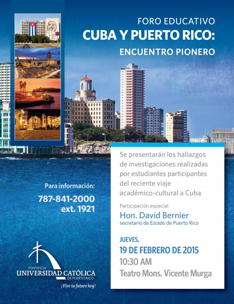 Foro educativo Cuba y Puerto Rico: encuentro Pionero By celimer_torres@pucpr.edu | January 16, 2015 Posted in General ← Listo para su público el Teatro Mons. Vicente MurgaSólida la voz de La Católica en la apertura con Cuba →