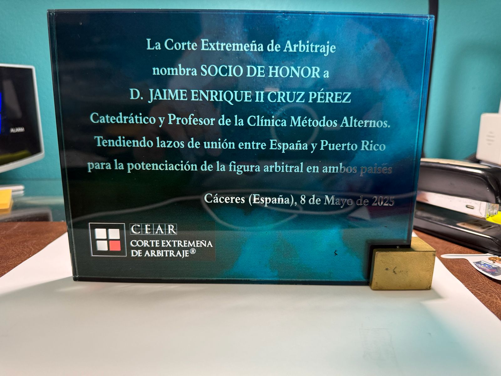 “Recibir esta distinción, como Socio de Honor de la Corte Extremeña de Arbitraje, junto a nuestro presidente, el Prof. José Antonio Frontera Agenjo, es un privilegio y honor, que nos sigue motivando a trabajar con más fuerzas y ahínco, para darles nuevas oportunidades académicas y de investigación a nuestros estudiantes y profesores para que adquieran conocimientos y experiencias a nivel internacional, más allá de lo que son los sistemas jurídicos tradicionales de litigación en Puerto Rico y Estados Unidos de América”, indicó el Prof. Jaime Enrique II Cruz Pérez, a Huellas del Futuro.