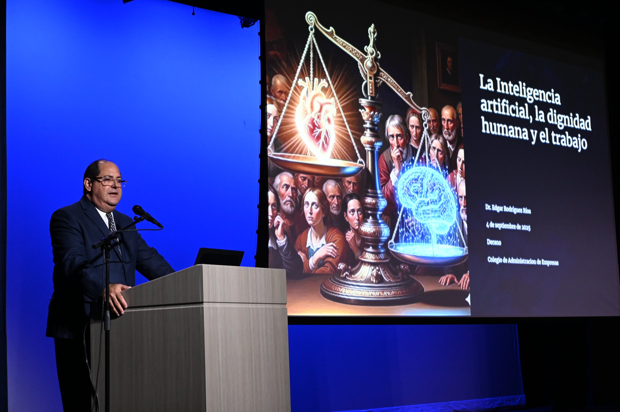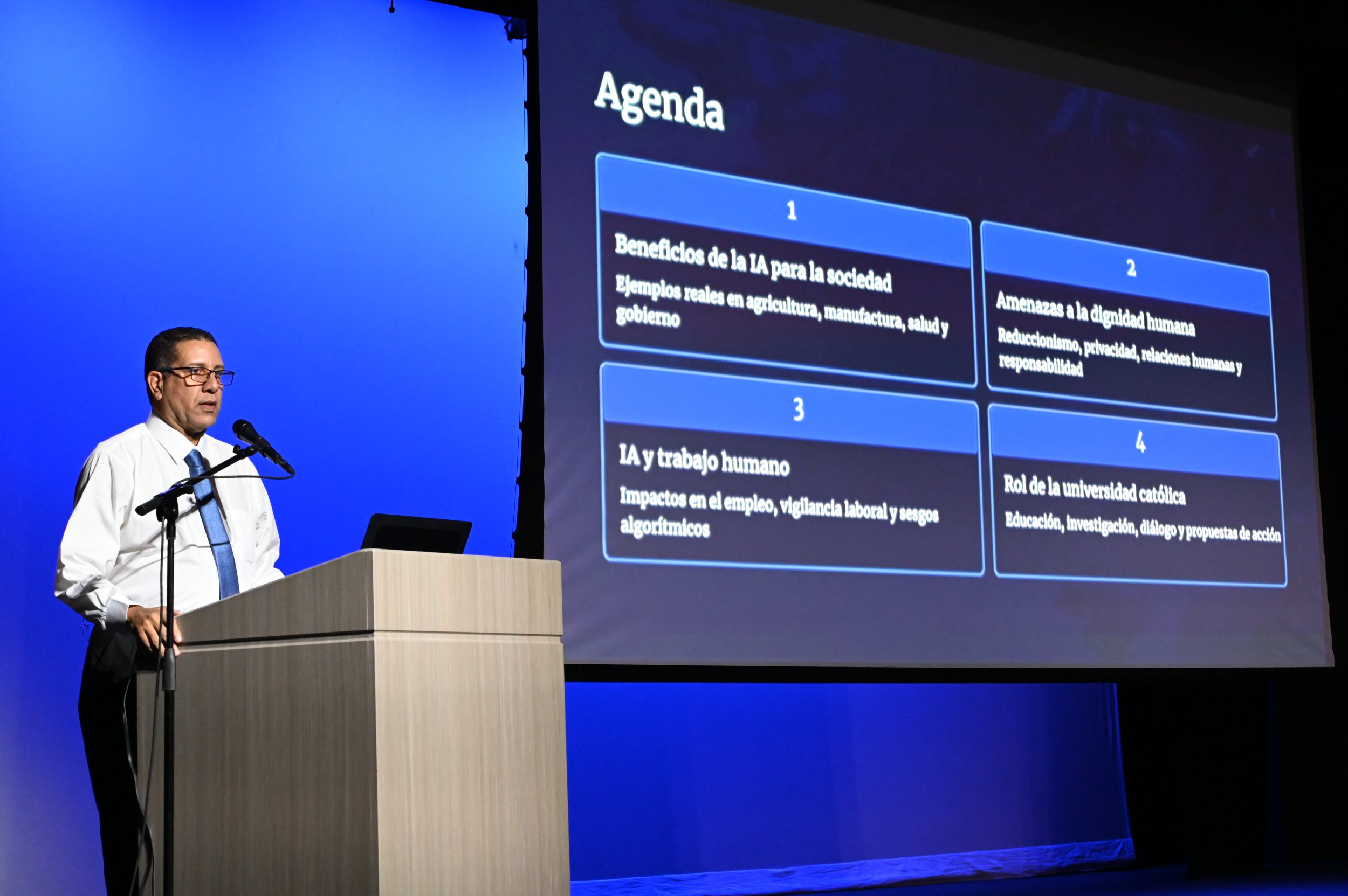 El Lcdo. Israel Santiago, director del Instituto de Doctrina Social de la Iglesia de la PUCPR, expresó que Nos encontramos en un cambio de época, como bien ha señalado el Papa Francisco. El acelerado avance tecnológico, particularmente en el campo de la Inteligencia Artificial, nos reta a iluminar la realidad con los principios de la Doctrina Social de la Iglesia para proteger la dignidad del ser humano y del trabajo”.