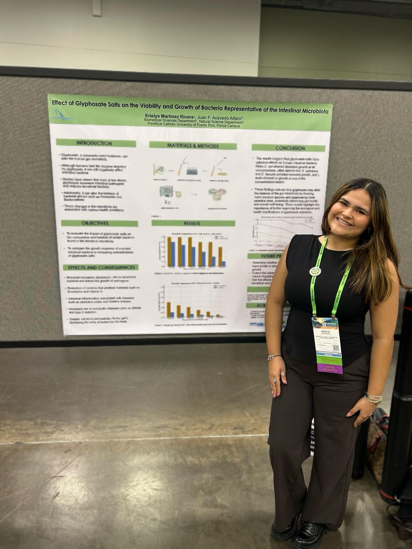 En este prestigioso foro, Erielys Martínez Rivera, estudiante de cuarto año del programa de Ciencias Biomédicas, se convirtió en la única representante de la Pontificia Universidad Católica de Puerto Rico en participar del evento. Bajo la mentoría del Prof. Juan F. Acevedo Alfaro, Martínez Rivera presentó su investigación titulada “Efecto de las sales de glifosato sobre la viabilidad y el crecimiento de bacterias representativas del microbiota intestinal.”