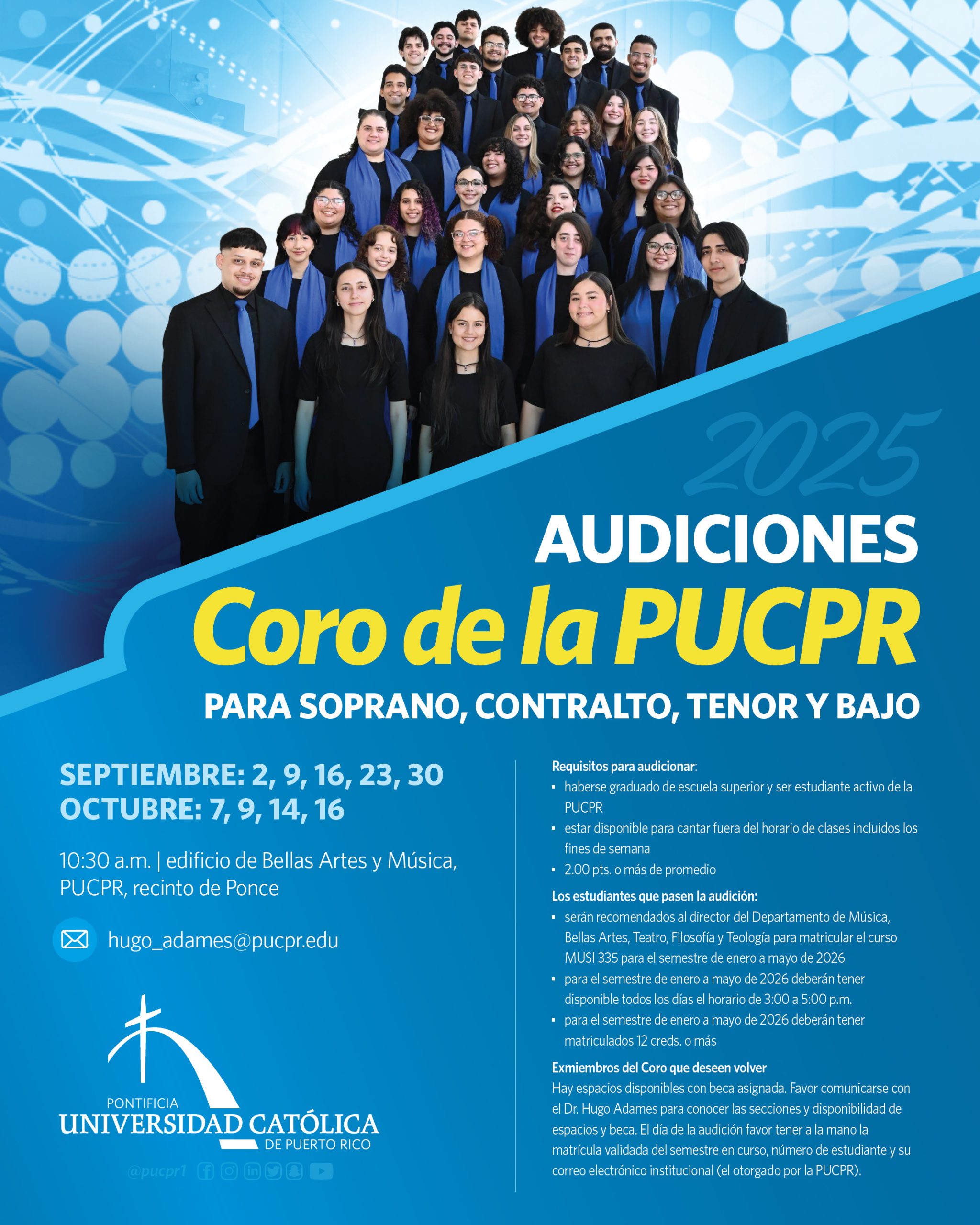 ¡Se buscan sopranos, contralto, tenor y bajo! By celimer_torres@pucpr.edu | August 28, 2025 Participa en las audiciones del Coro de la PUCPR Posted in General ← Simposio sobre el 60 aniversario de la Nostra aetateBienvenida en la Universidad Central de Bayamón →